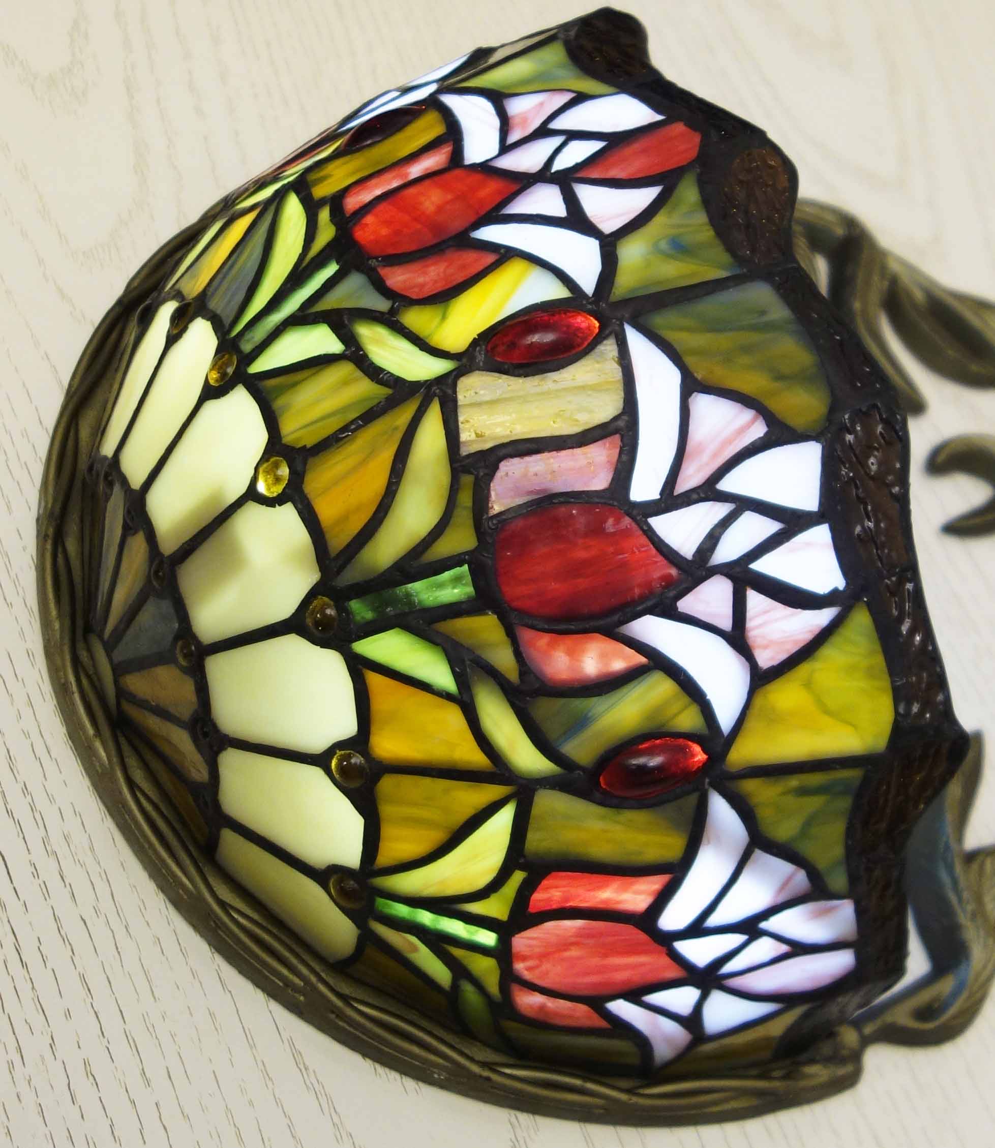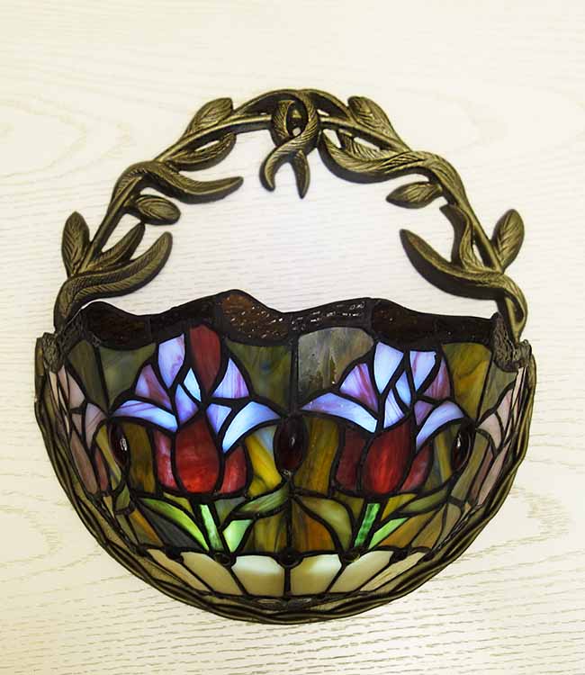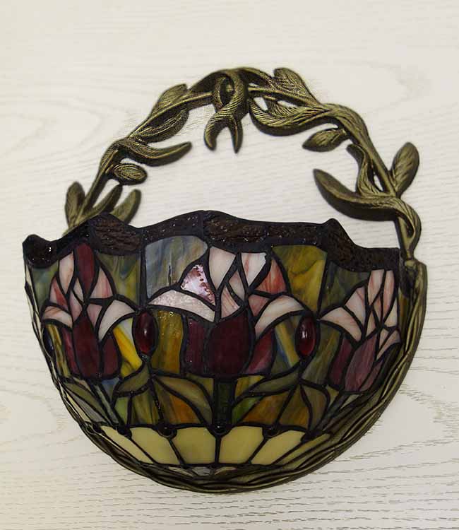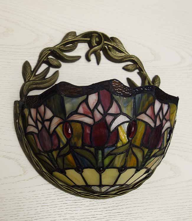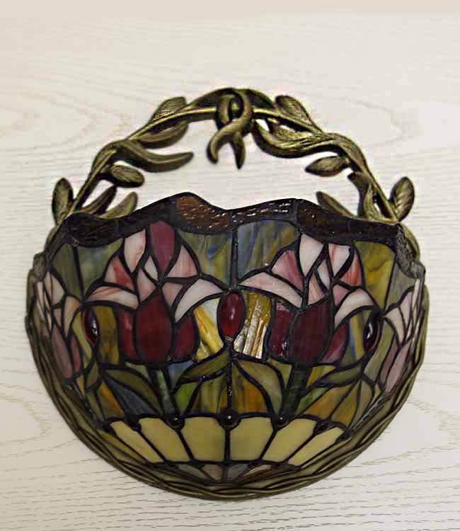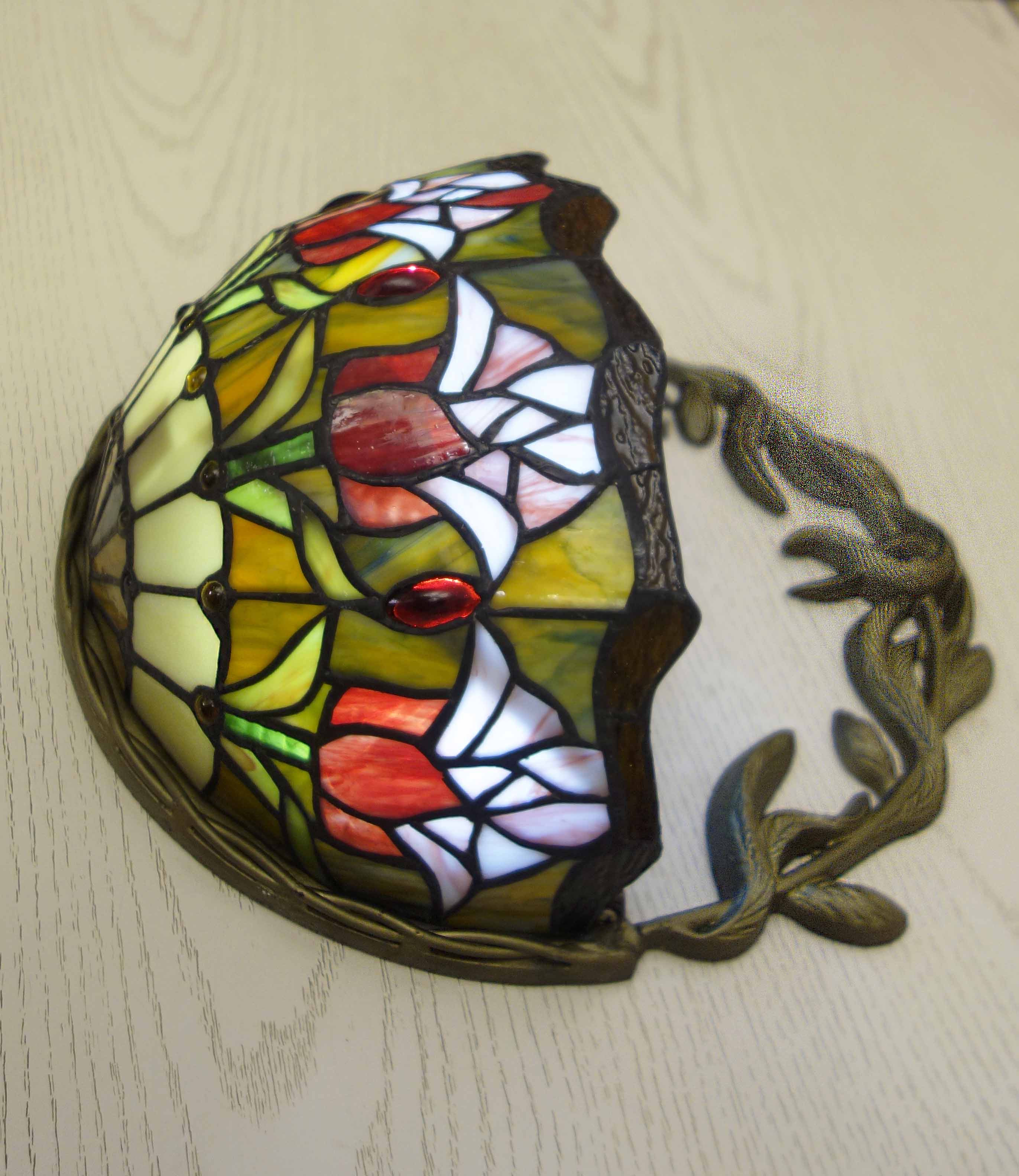 Светильник Тиффани бра. Витражное цветное стекло. Оригинальный рисунок плафона подойдет для классического интерьера загородного дома, гостиной, спальни, коридора, прихожей. Оригинальный дизайн и форма. Бра Тиффани – это изящество и роскошь, мягкий свет и уют.