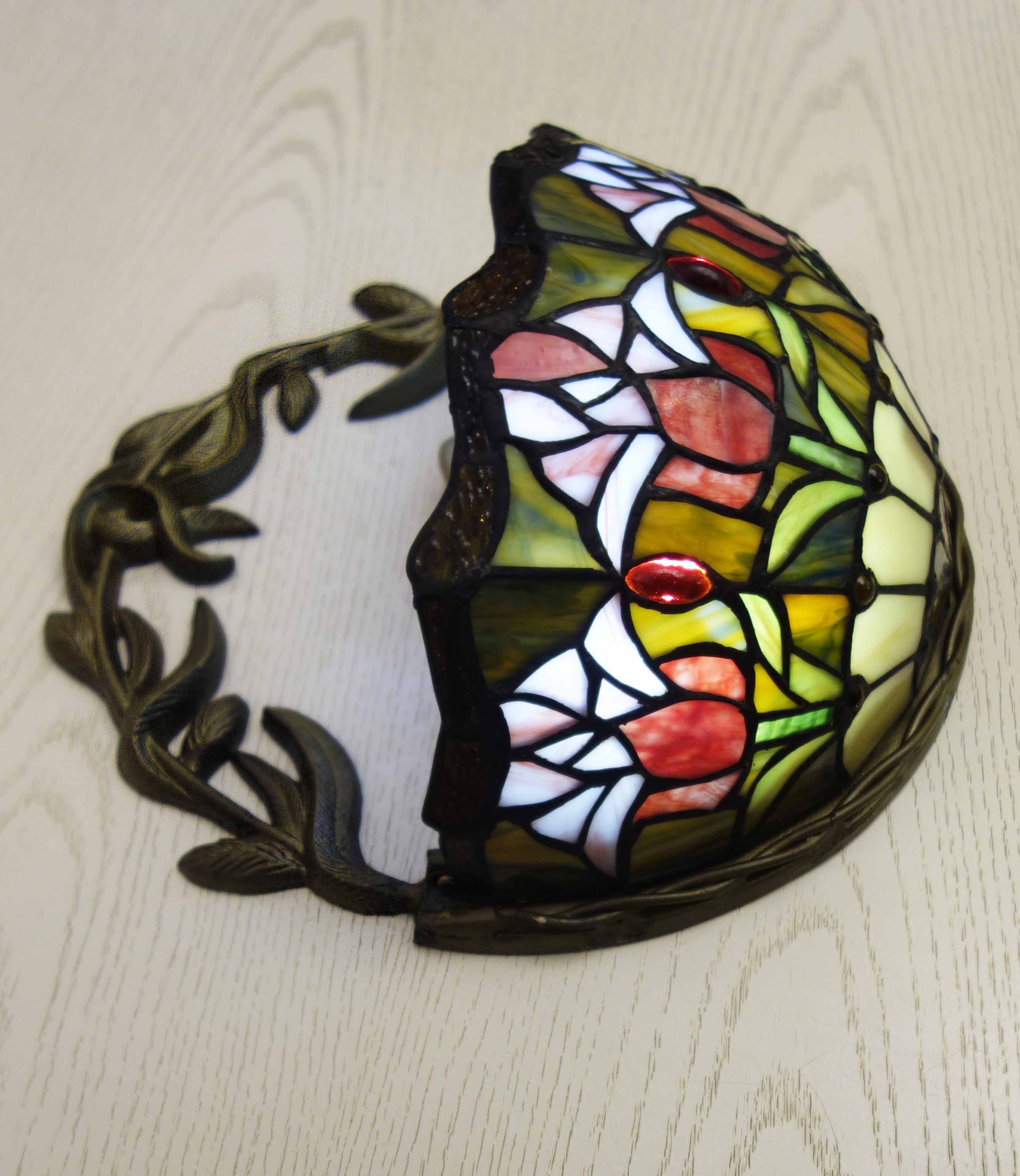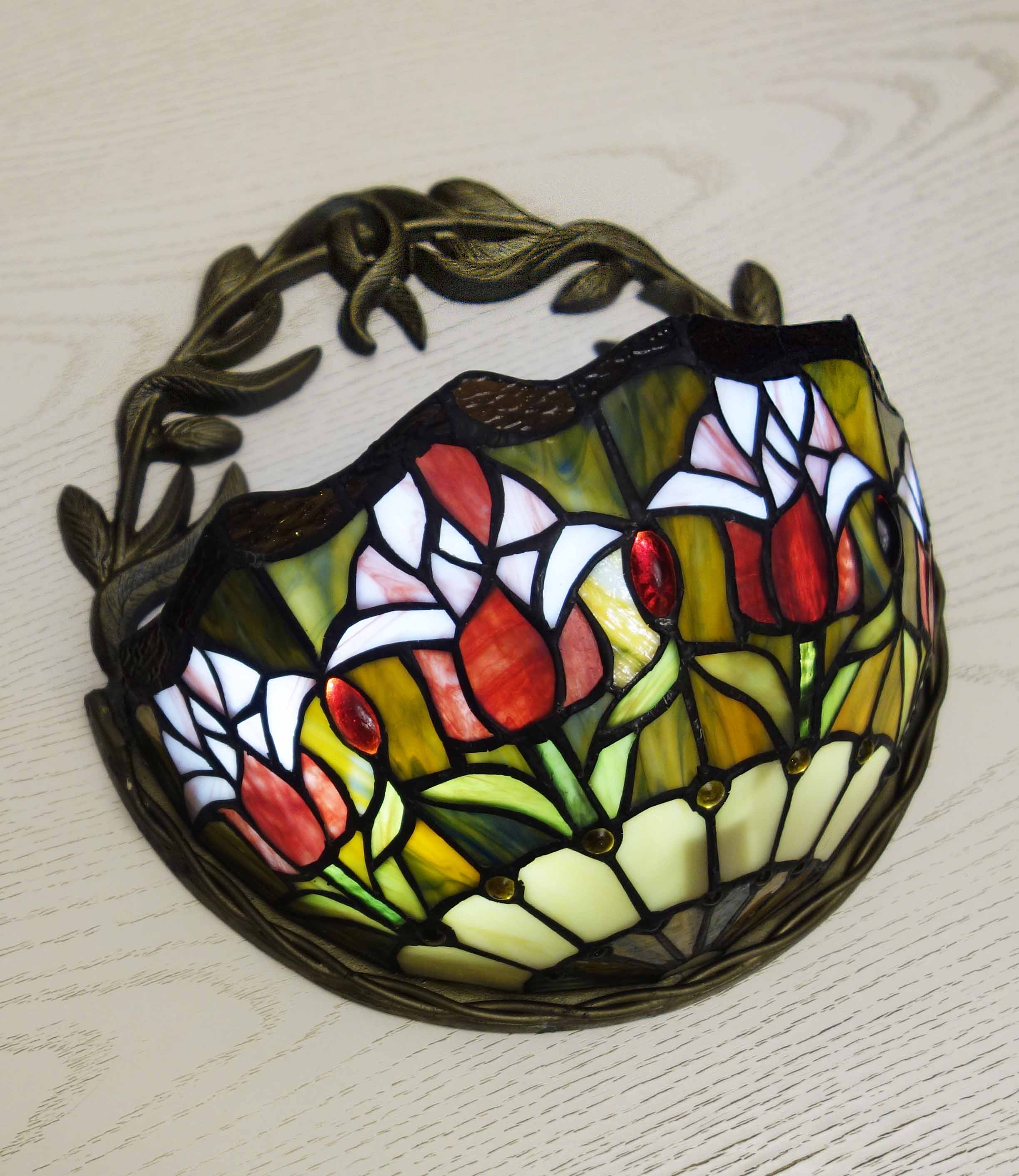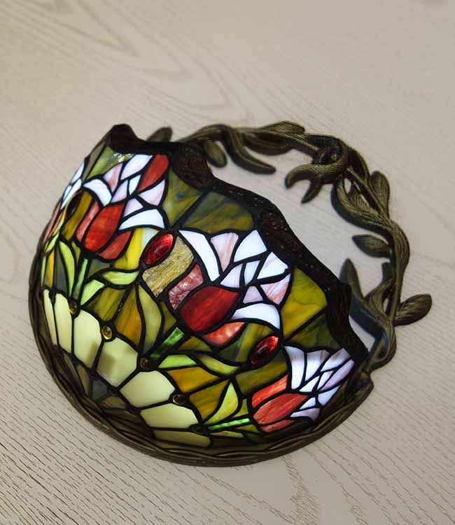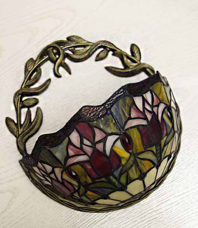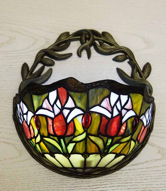 Светильник Тиффани бра. Витражное цветное стекло. Оригинальный рисунок плафона подойдет для классического интерьера загородного дома, гостиной, спальни, коридора, прихожей. Оригинальный дизайн и форма. Бра Тиффани – это изящество и роскошь, мягкий свет и уют.
