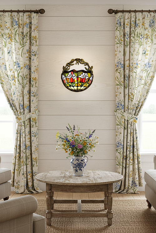 Светильник Тиффани бра. Витражное цветное стекло. Оригинальный рисунок плафона подойдет для классического интерьера загородного дома, гостиной, спальни, коридора, прихожей.