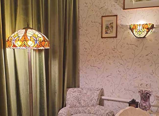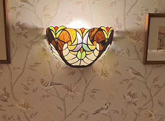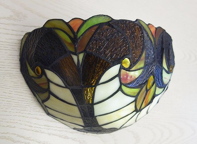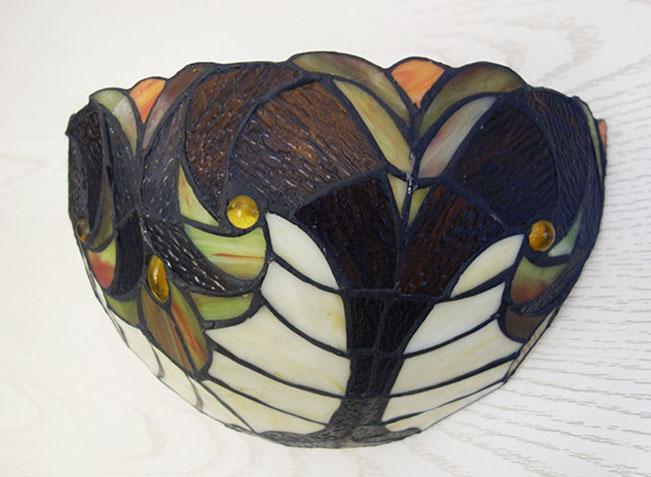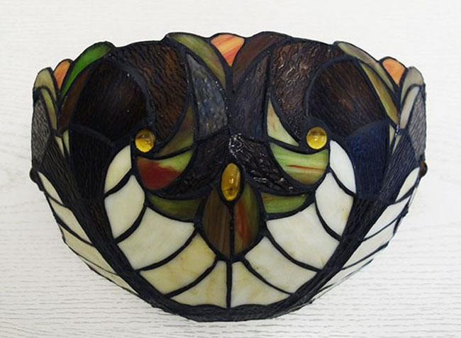 Светильник Тиффани бра. Витражное цветное стекло. Оригинальный рисунок плафона подойдет для классического интерьера загородного дома, гостиной, спальни, коридора, прихожей. Оригинальный дизайн и форма. Бра Тиффани – это изящество и роскошь, мягкий свет и уют.