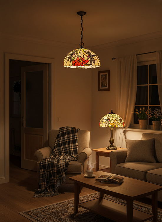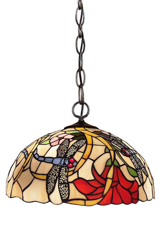 Витражное цветное стекло. Фурнитура: металл, цвет бронза. Основной цвет плафона: слоновая кость (теплый белый с мраморными нитями), рисунок: красный, оранжевый, розовый, голубой