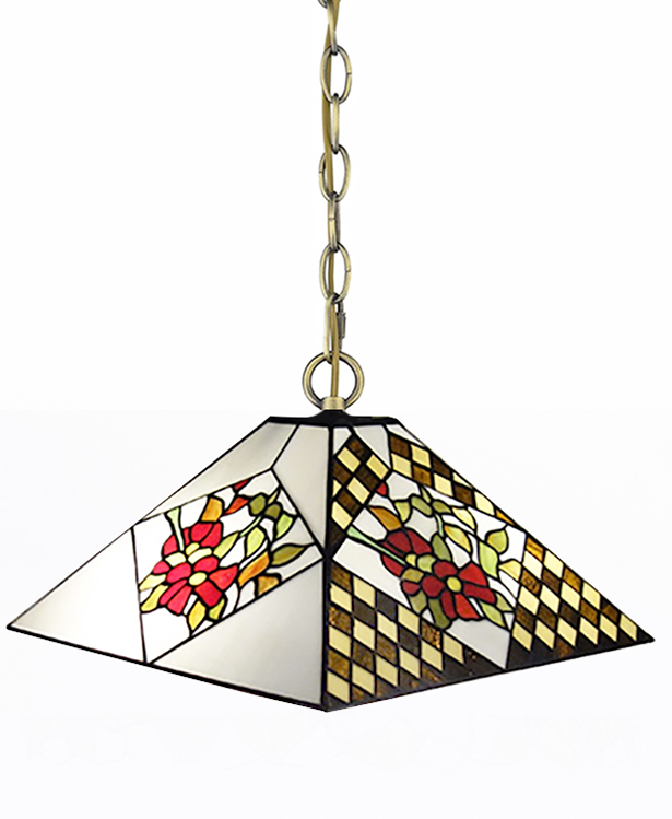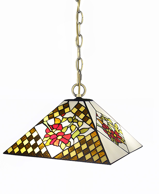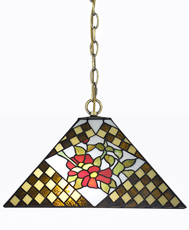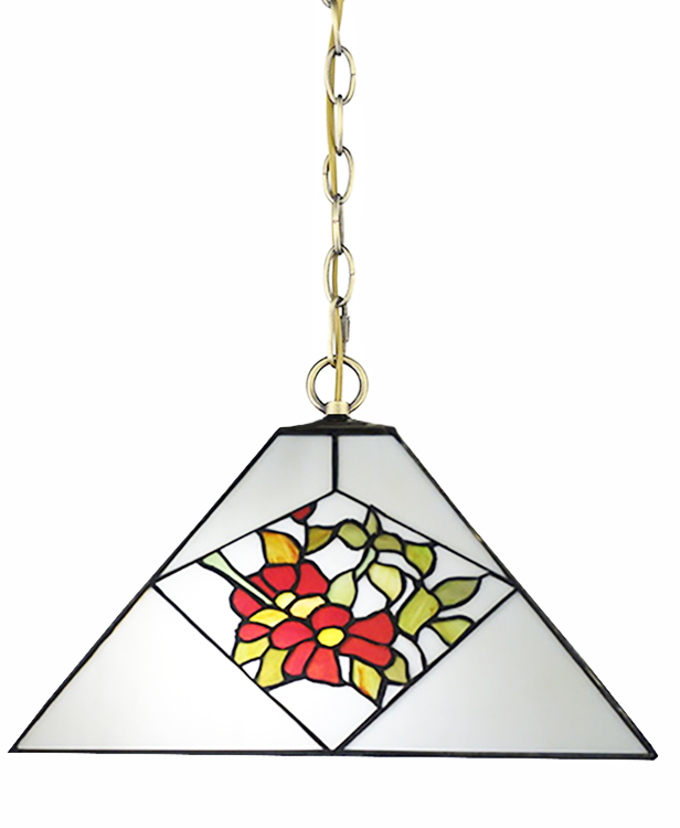 Подвесная люстра Тиффани. Создана вручную. Витражное цветное стекло. Оригинальный рисунок плафона подойдет для классического интерьера загородного дома, гостиной, спальни, коридора, прихожей. Фурнитура бронзового цвета.