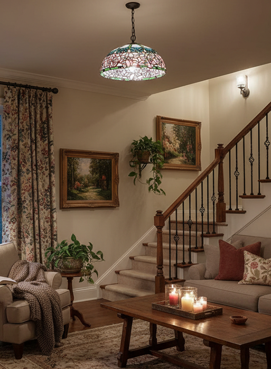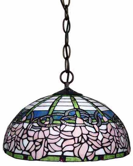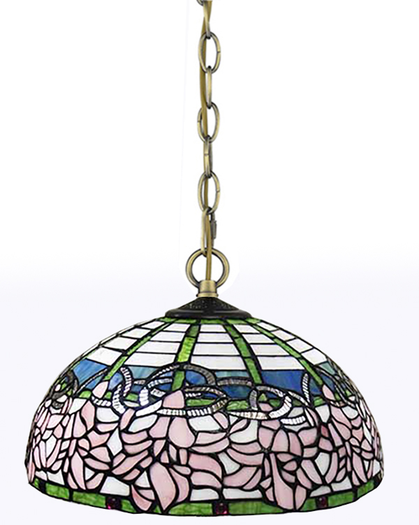Плафон светильника Тиффани изготовлен из витражного стекла в светлых тонах. Ручная работа. Классический цветочный узор. Фурнитура бронзового цвета. Люстра в стиле Тиффани: Идеальное решение для столовой или гостиной. Эта люстра привнесет в помещение атмосферу роскоши и утонченности благодаря характерным витражным элементам и цветочным мотивам.