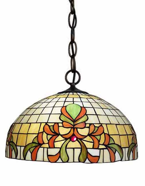 Подвесной светильник Tiffany выполнен из витражного стекла. Ручная работа. Геометрический рисунок в сочетании с изящными повторяющимися узорами. Фурнитура из металла бронзового цвета.