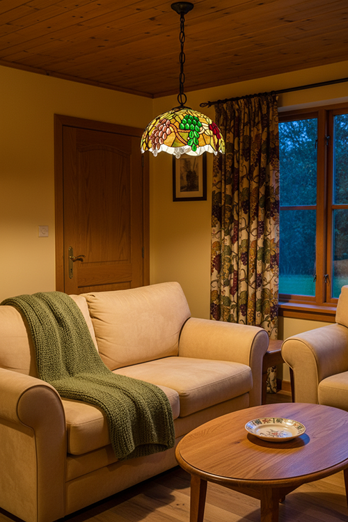 Подвесной светильник Tiffany выполнен из витражного стекла. Ручная работа. Чередующиеся гроздья винограда: красные, зеленые, розовые. Фурнитура из металла бронзового цвета.