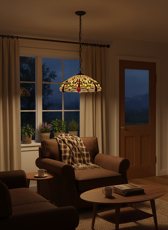 Финальным акцентом в таком интерьере Вам послужит комплект светильников тиффани со стрекозами.