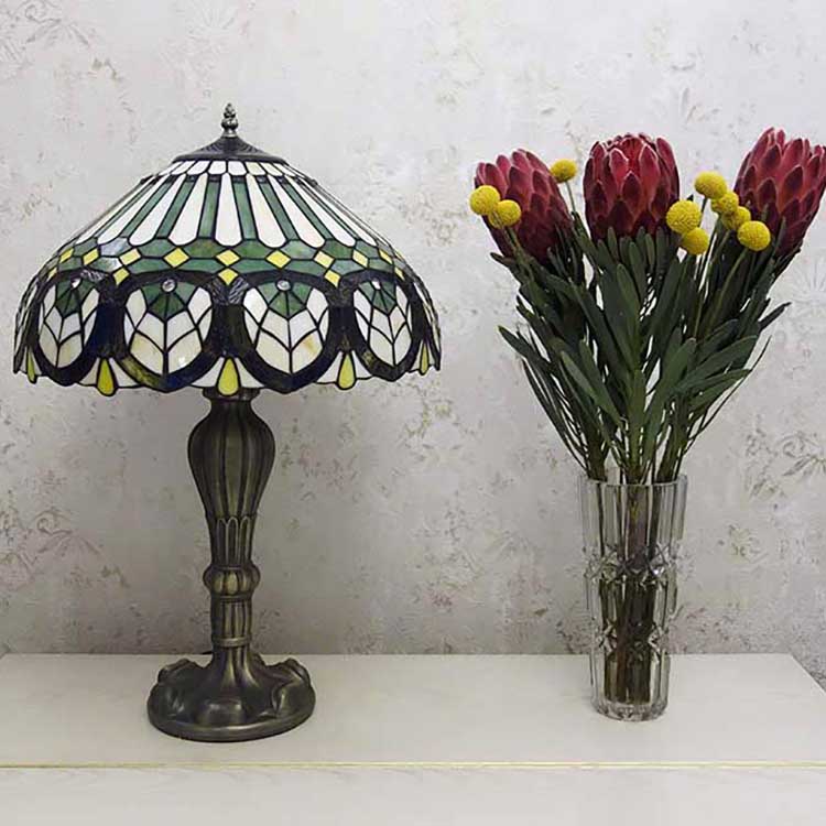 Плафон из витражного стекла с повторяющимся геометрическим рисунком в виде полосок, украшенных прозрачными каплями из стекла, по краю плафона - изящные паутинки с каплей воды. Классическая бронзовая ножка с переключателем на шнуре.