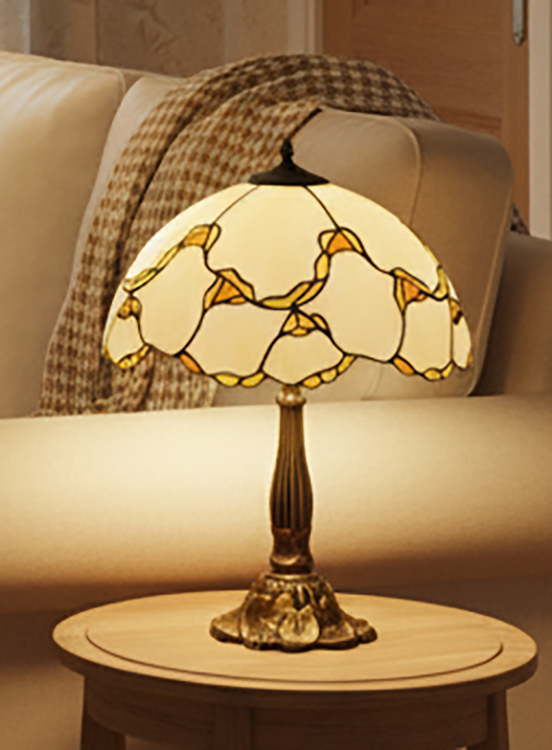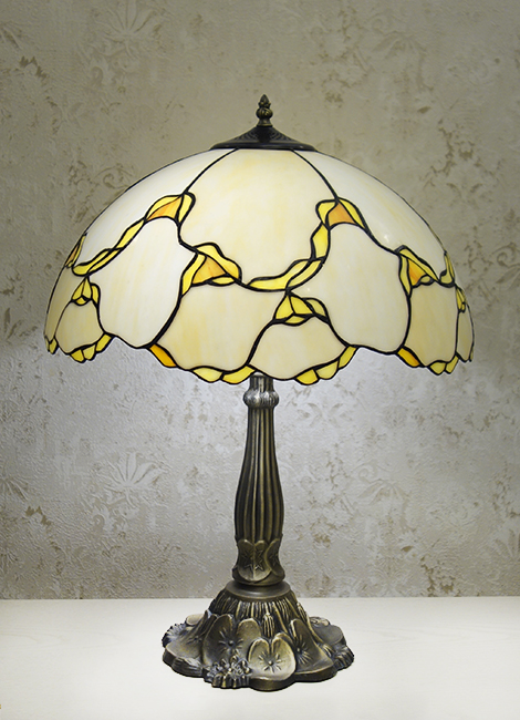 Настольная лампа тиффани. Создана вручную. Витражное цветное стекло. Оригинальный рисунок плафона подойдет для классического интерьера загородного дома, гостиной, спальни, коридора, прихожей. Ножка металлическая, бронзового цвета. Переключатель на шнуре.