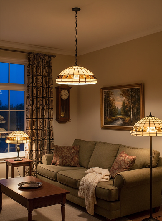 - Уникальная атмосфера: Мягкий, рассеянный свет, проходящий через витраж, создает уютную и расслабляющую атмосферу. Геометрические узоры, подсвеченные изнутри, оживают, наполняя комнату игрой света и тени.