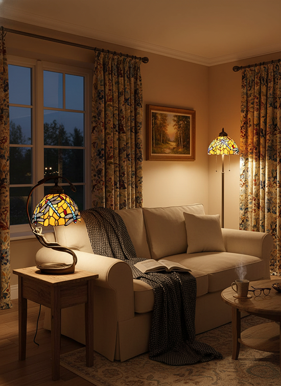 Плафон - витражное стекло, ножка металлическая с утяжеление в основании, сбалансирована, устойчива, стилизована под бронзу. Переключатель на шнуре.