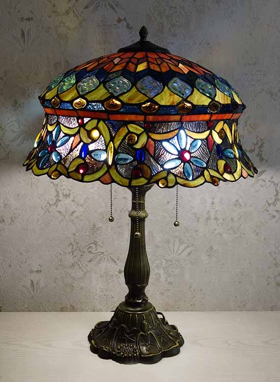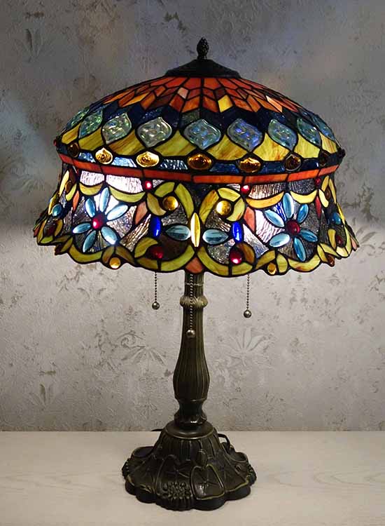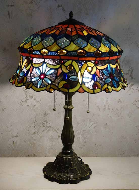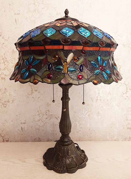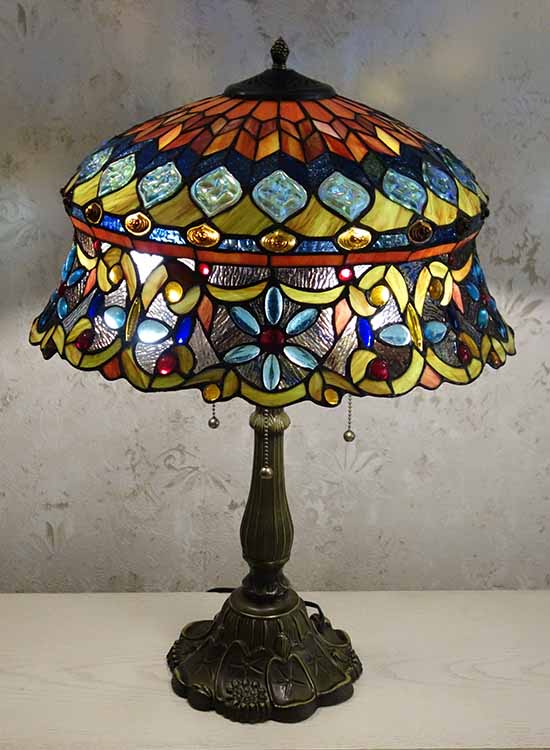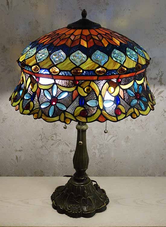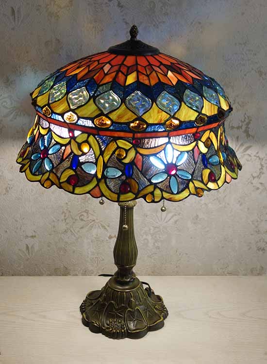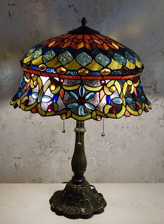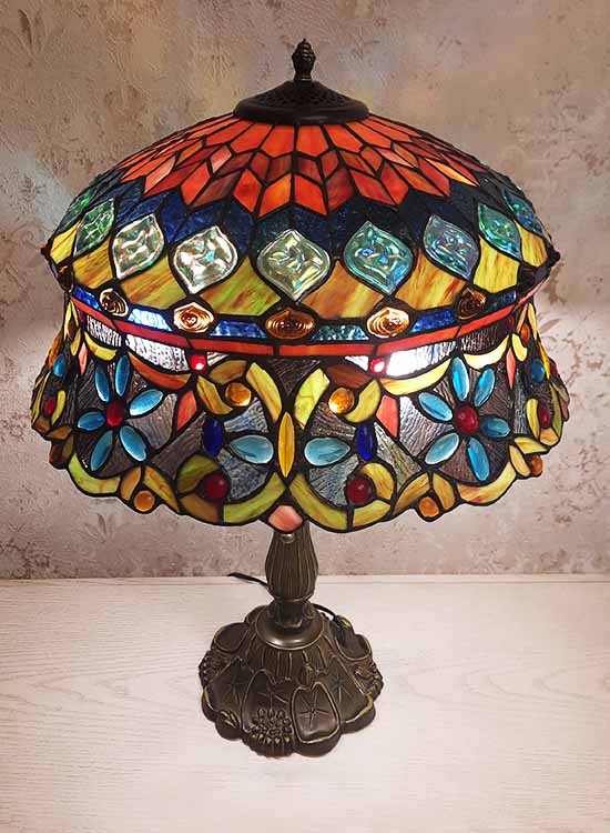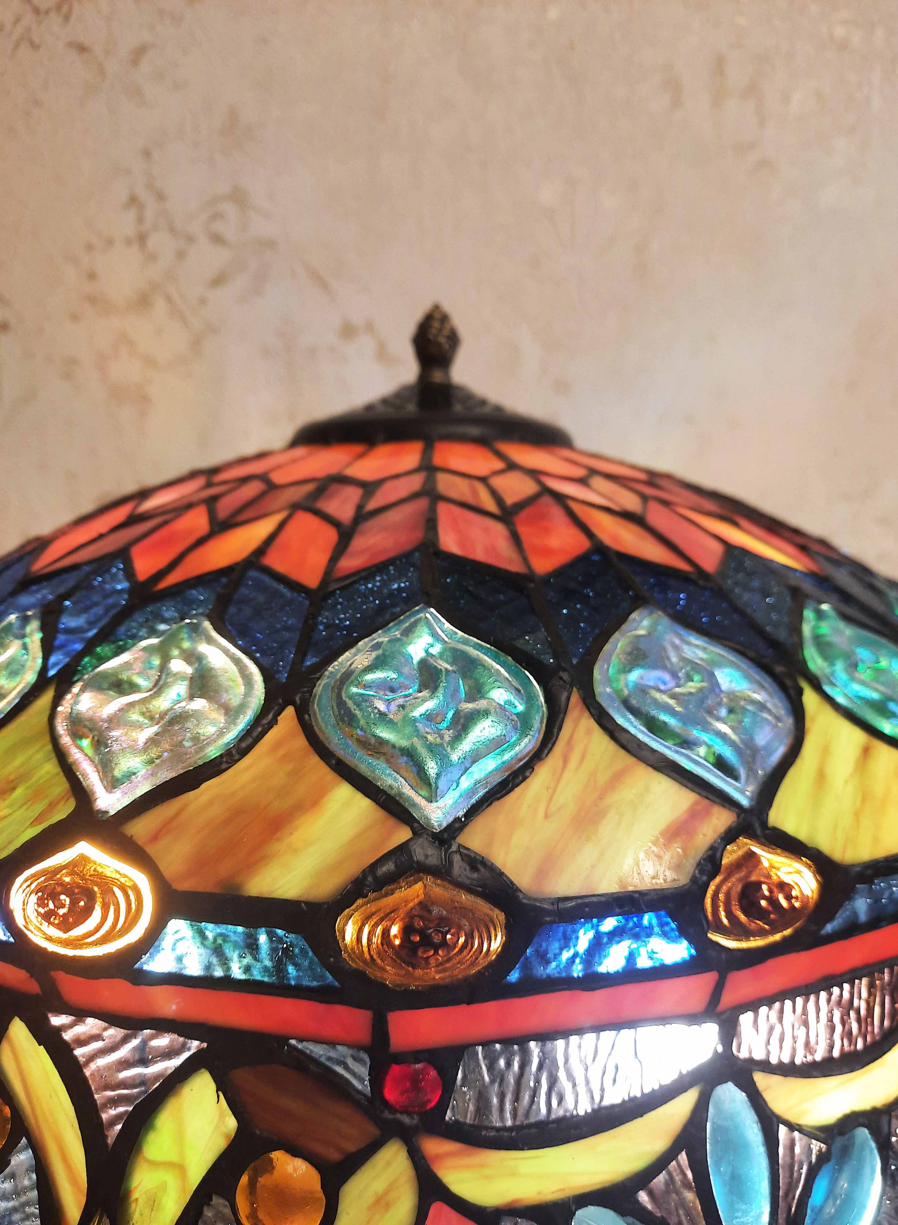 Светильник Тиффани настольный из витражного стекла. Выполнен вручную. Яркий насыщенный цвет плафона несомненно будет притягивать взгляд его владельца и радовать игрой красочного света. Витражное стекло. Ножка-металл, цвет-бронза.