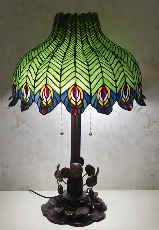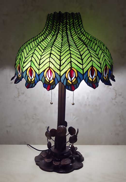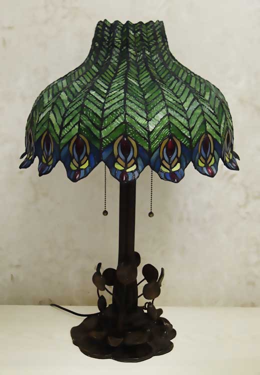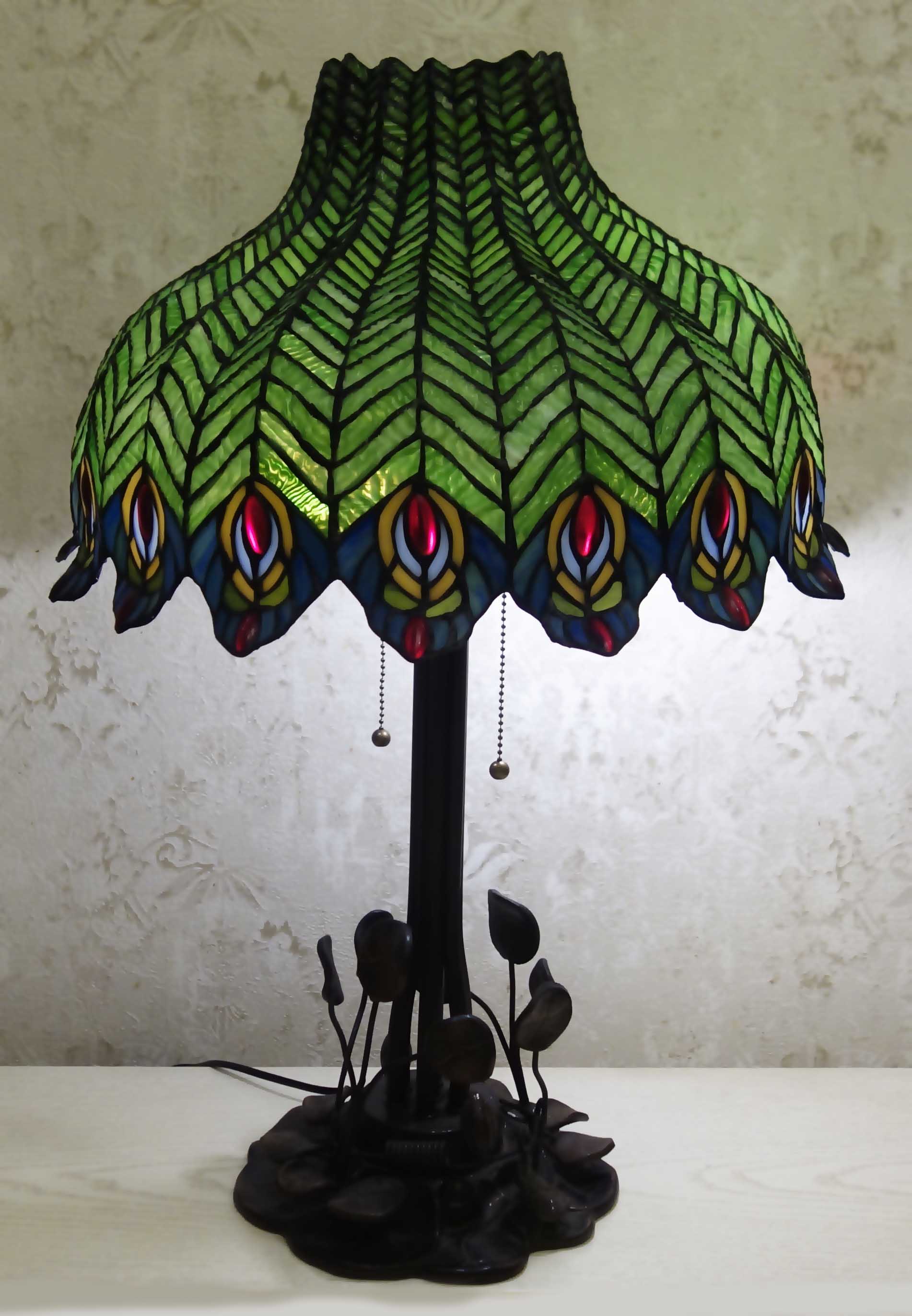 Диаметр 46см высота 68см витражное стекло, ручная работа Ножка металл, цвет коричневый Переключатель на шнуре, а так же "дергалки"