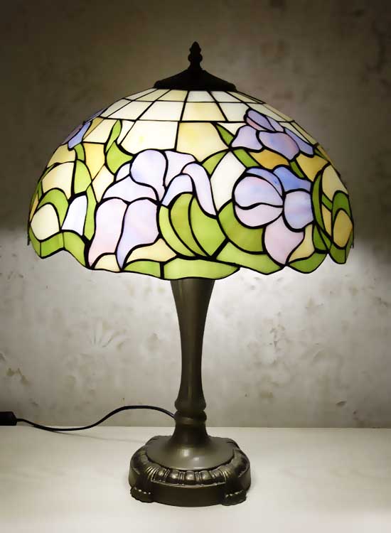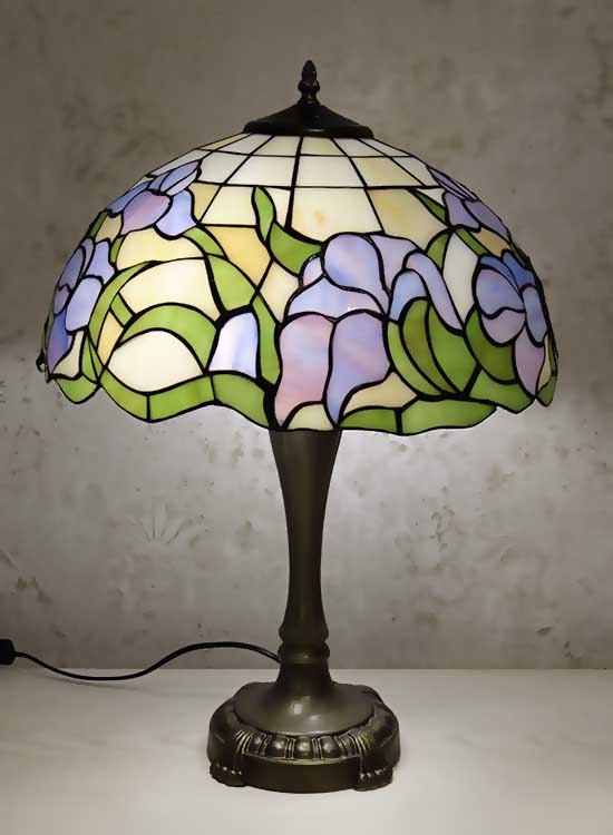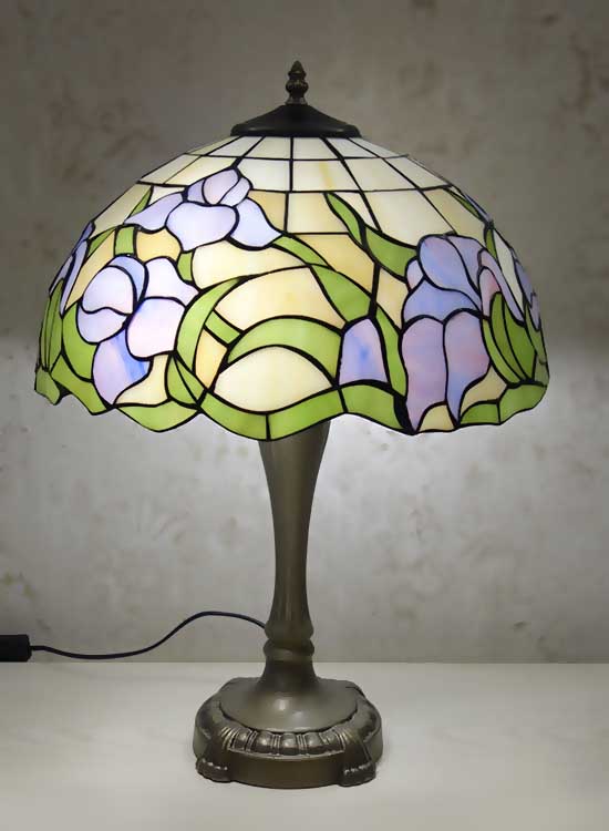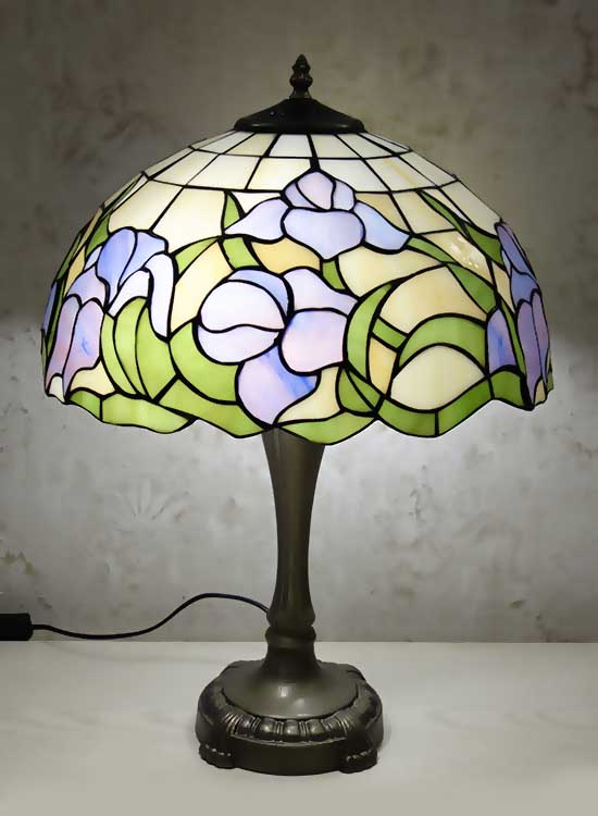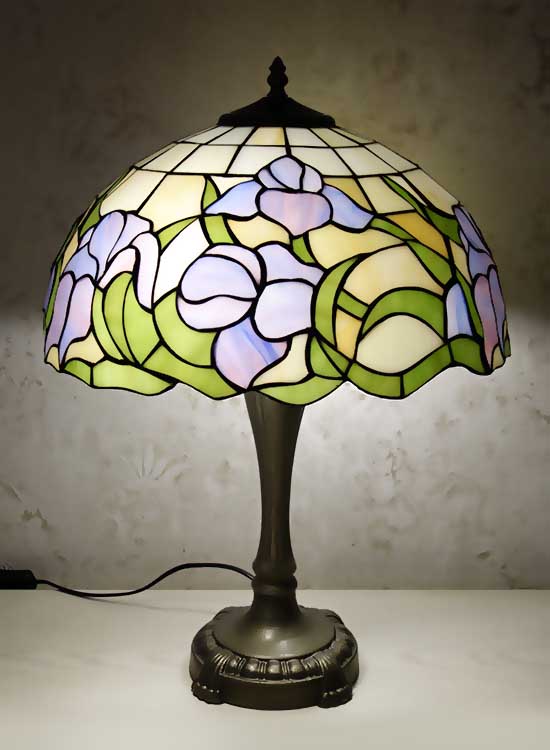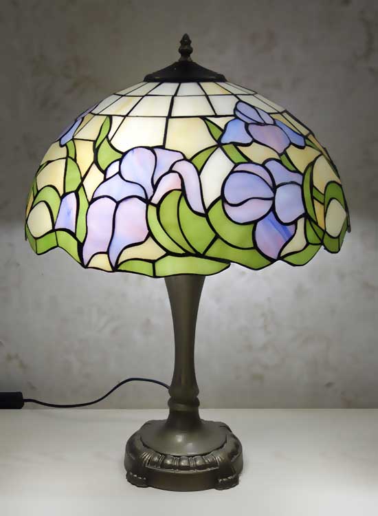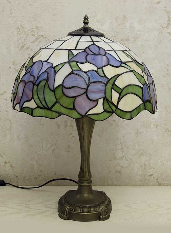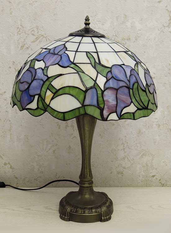 Классическая настольная лампа в стиле тиффани. Рисунок на плафоне - цветы ирисы. Витражное стекло. Ручная работа. Металлическая ножка с переключателем на шнуре.