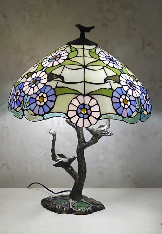 Диаметр плафона 46см высота 70см лампоки 3-60BT Е-27 Металлическая ножка в виде дерева с птичками с переключателем на проводе. Витражное стекло, ручная работа