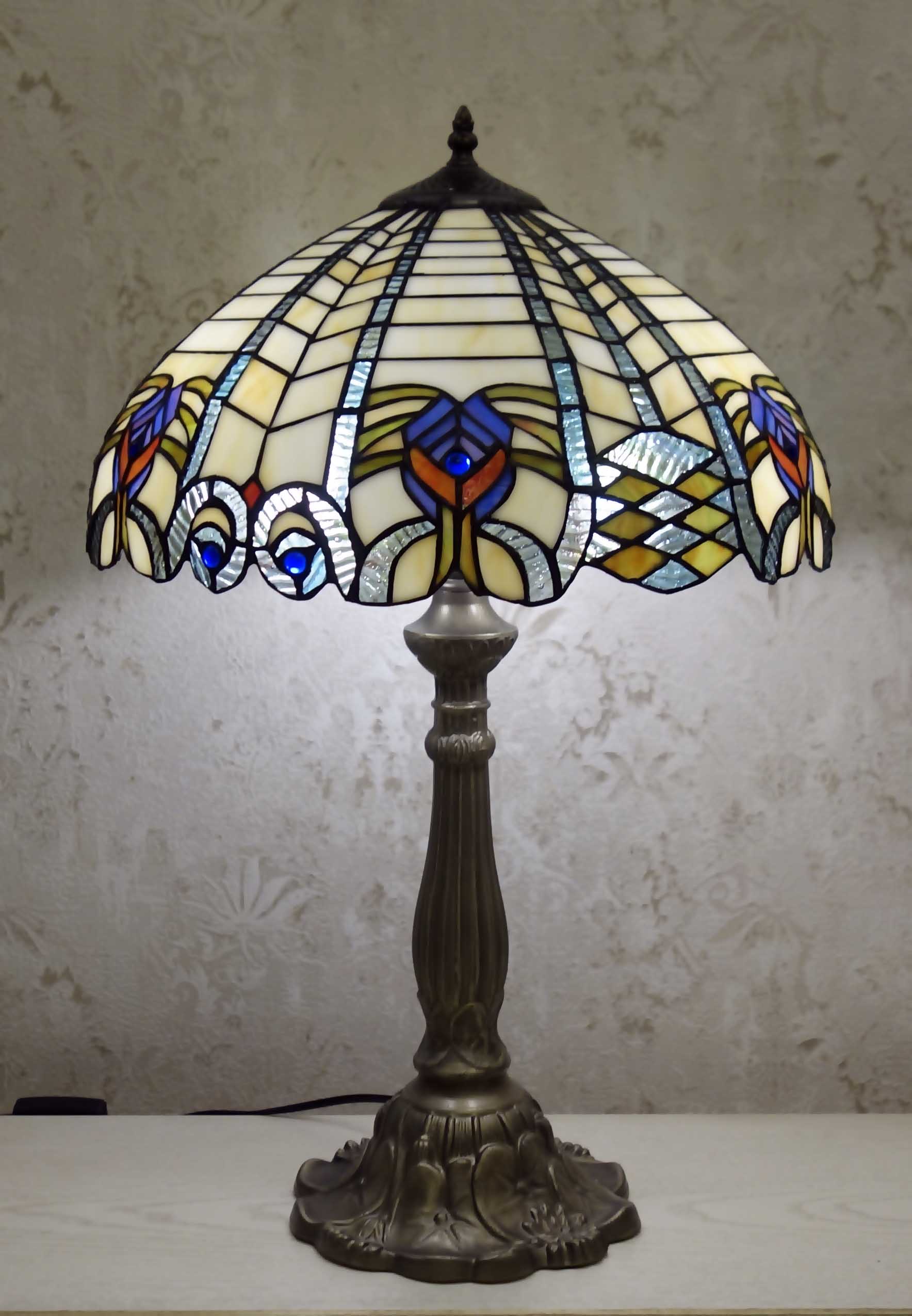 Диаметр плафона 41см высота 65см лампоки 3-60BT Е-27 Классическая металлическая ножка с переключателем на проводе. Витражное стекло, ручная работа