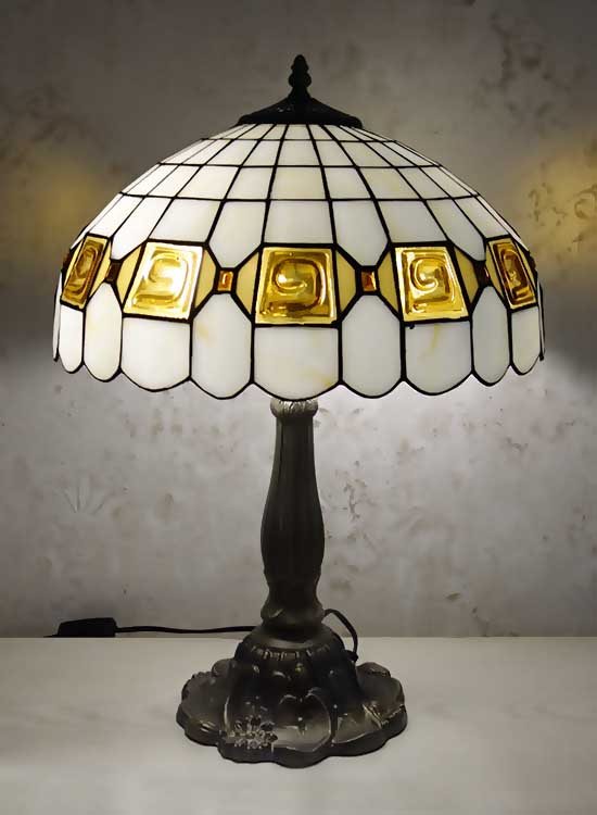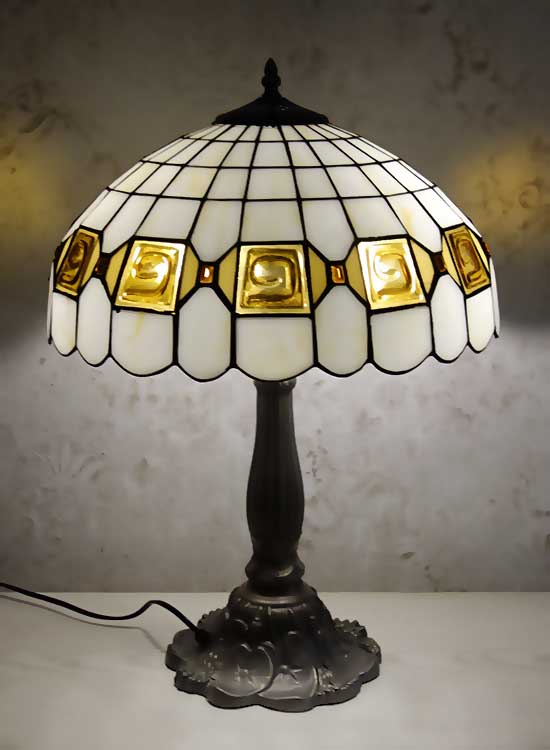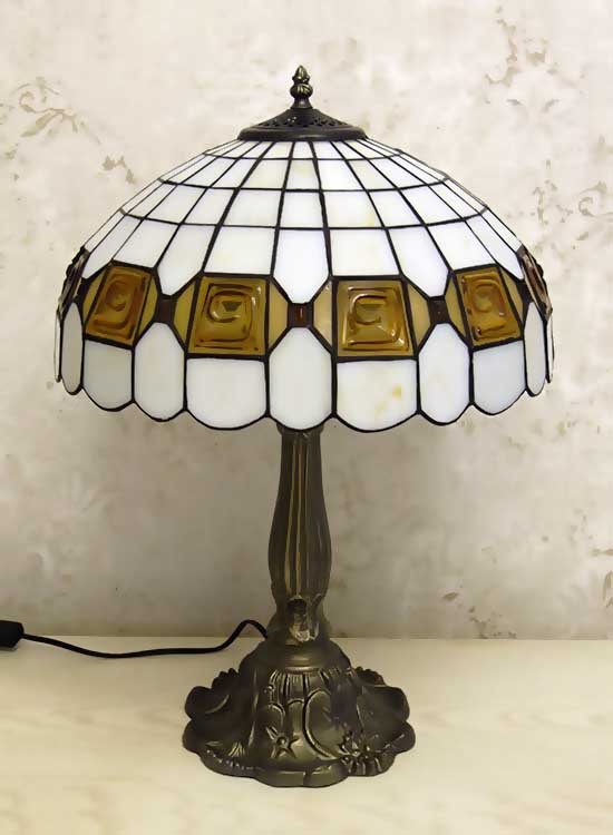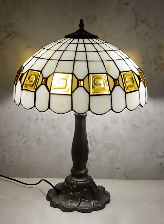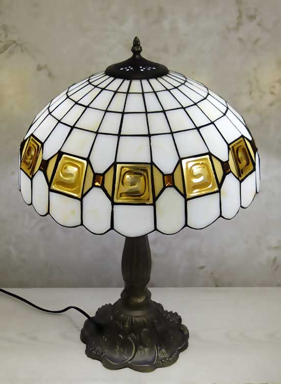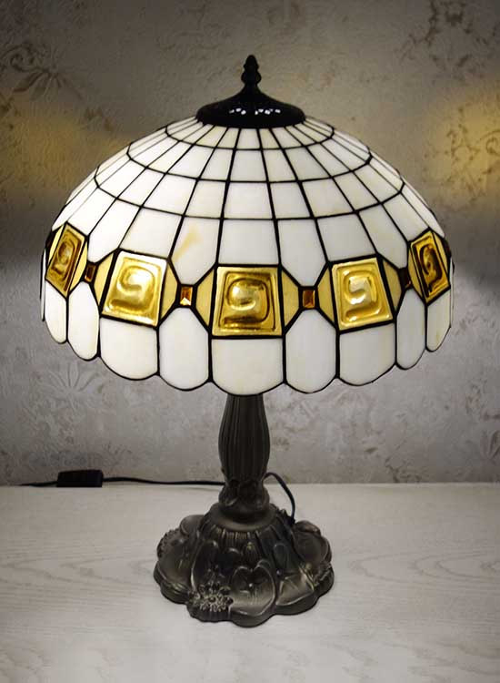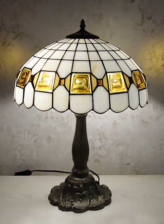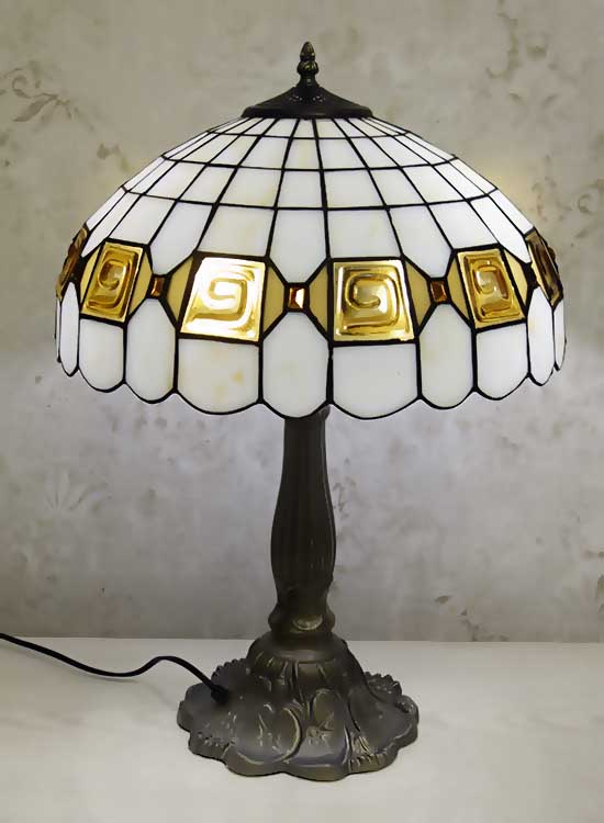 Лампа Тиффани со строгим геометрическим рисунком на плафоне ручной работы. Выполнен вручную. Ножка светильника металлическая, с ручным переключателем на шнуре. Витраж-стекло, техника исполнения тиффани. Идеально подходит для гостиной, спальни.