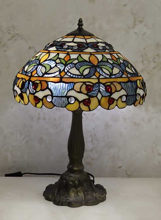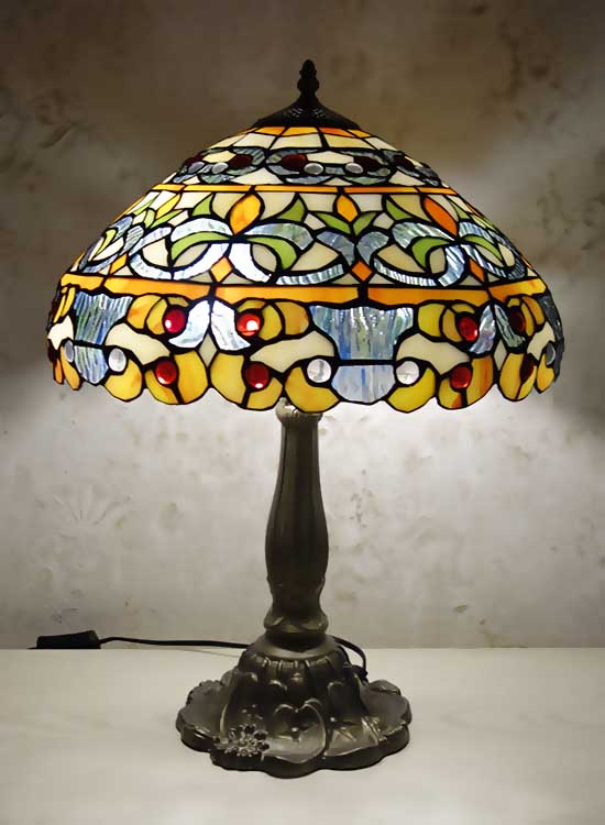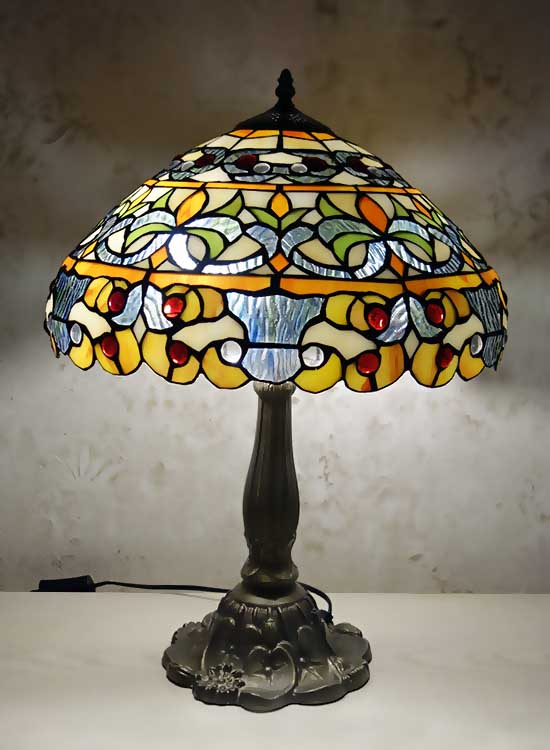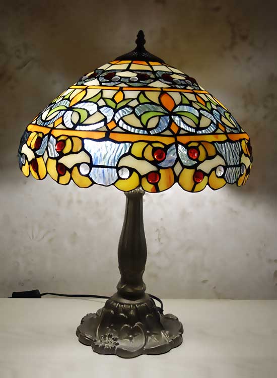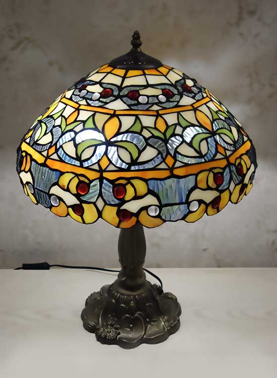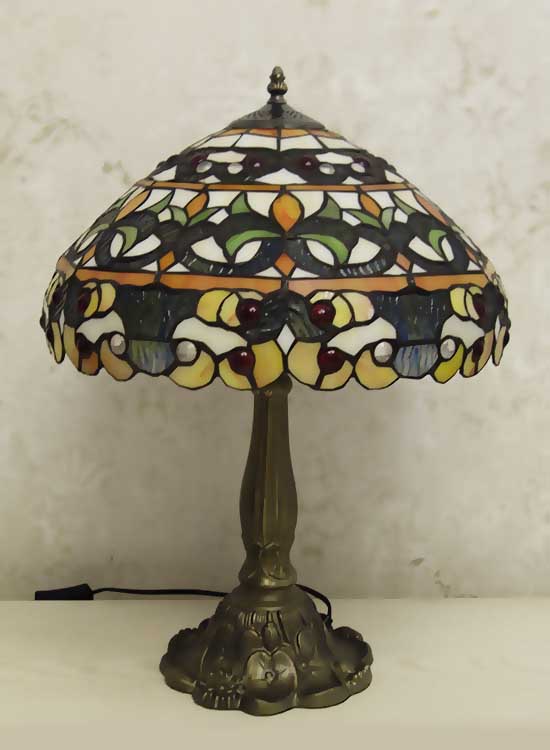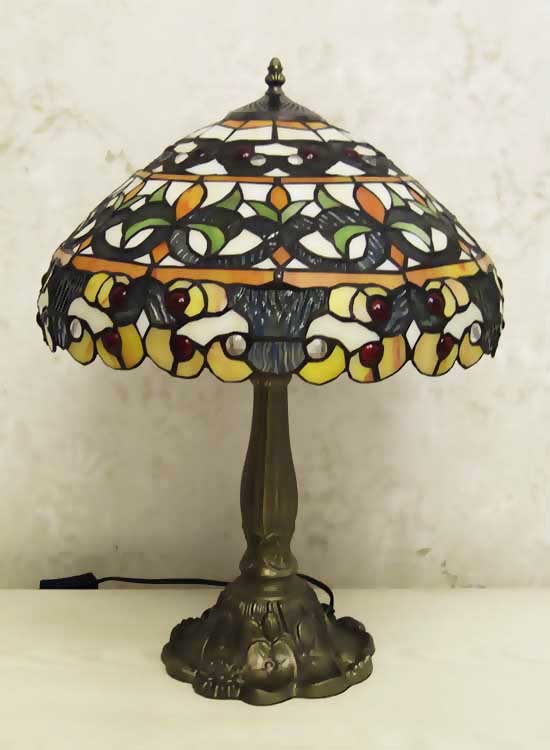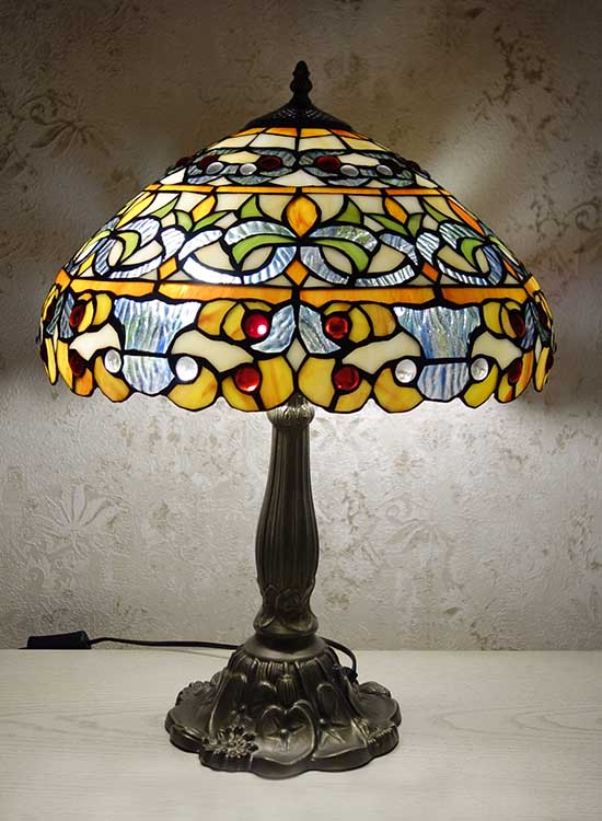 Лампа Тиффани с повторяющимся рисунком с природными мотивами на плафоне ручной работы. Ножка светильника металлическая, с ручным переключателем на шнуре. Витраж-стекло, техника исполнения тиффани. Идеально подходит для гостиной, спальни.