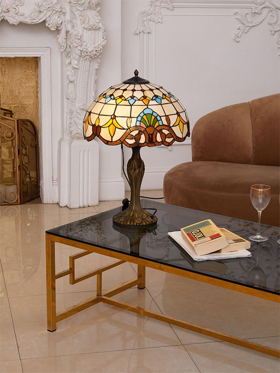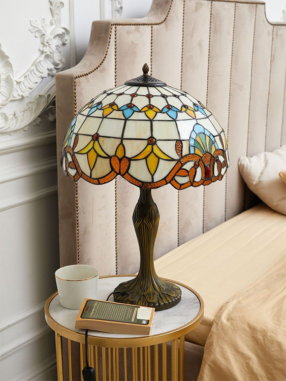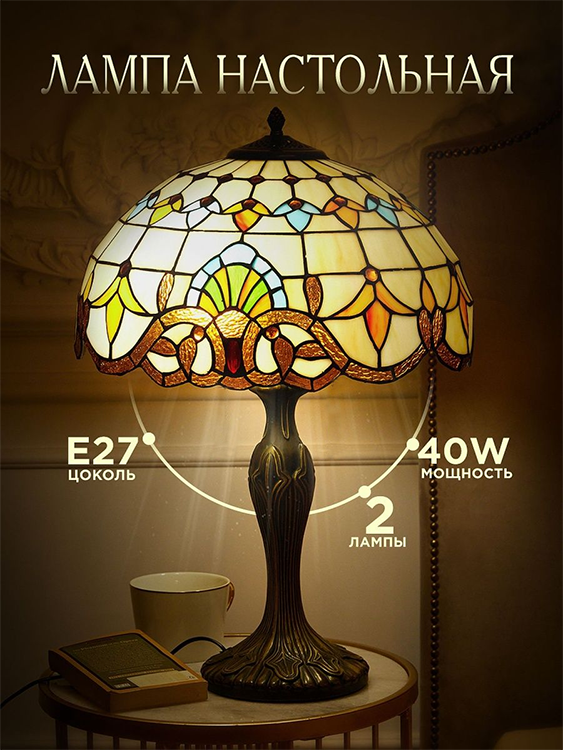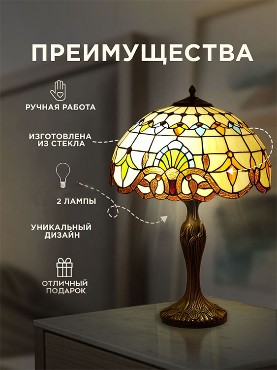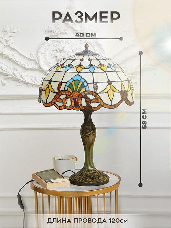 Настольный светильник Tiffany выполнен из витражного стекла. Ручная работа. Геометрический рисунок в сочетании с изящными повторяющимися узорами. Ножка лампы из металла бронзового цвета с переключателем на шнуре.