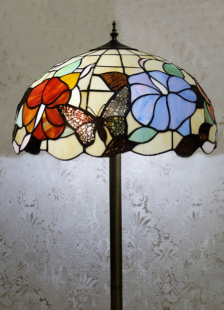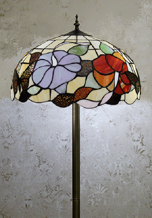 Напольный торшер тиффани. Сделан вручную. Витражное стекло. Оригинальный рисунок плафона подойдет для классического интерьера загородного дома, гостиной, спальни, коридора, прихожей. Ножка металлическая, бронзового цвета. Переключатель напольный – кнопка на шнуре.