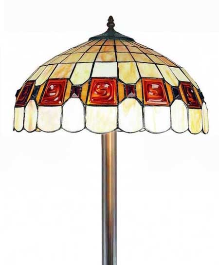 Торшер Тиффани со строгим геометрическим рисунком на плафоне ручной рабрты. Выполнен вручную. Ножка торшера металлическая, с напольным переключателем на шнуре. Витраж-стекло, техника исполнения тиффани.