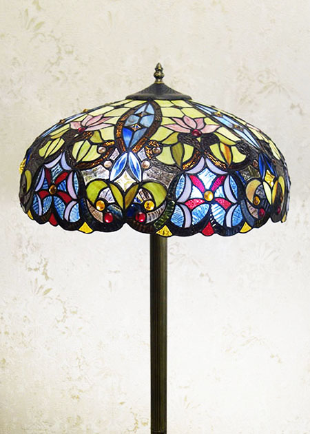 Напольный торшер тиффани. Сделан вручную. Витражное стекло. Оригинальный рисунок плафона подойдет для классического интерьера загородного дома, гостиной, спальни, коридора, прихожей. Ножка металлическая, бронзового цвета. Переключатель напольный – кнопка на шнуре.