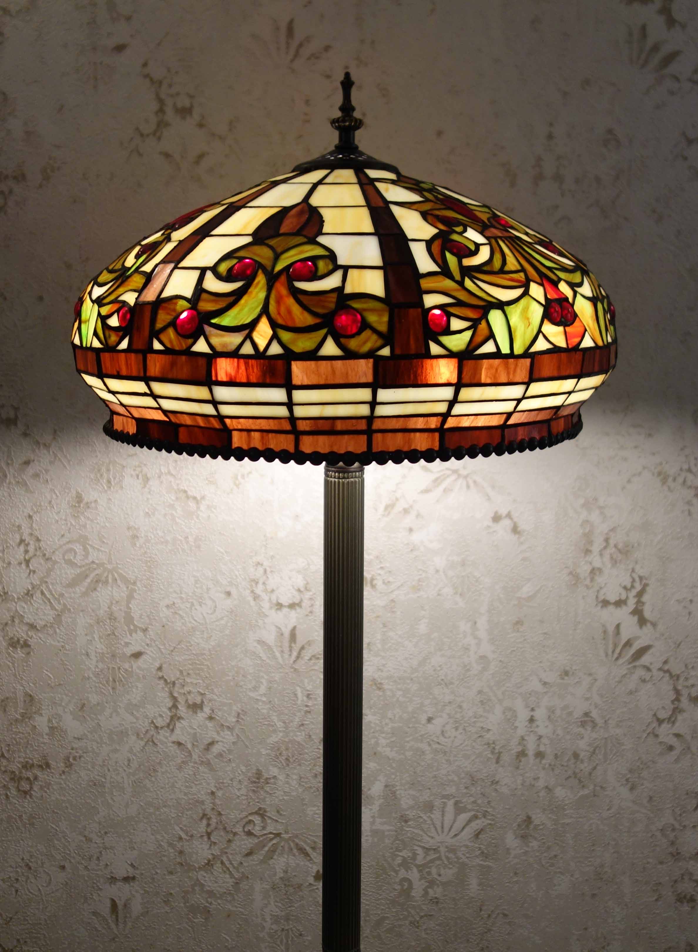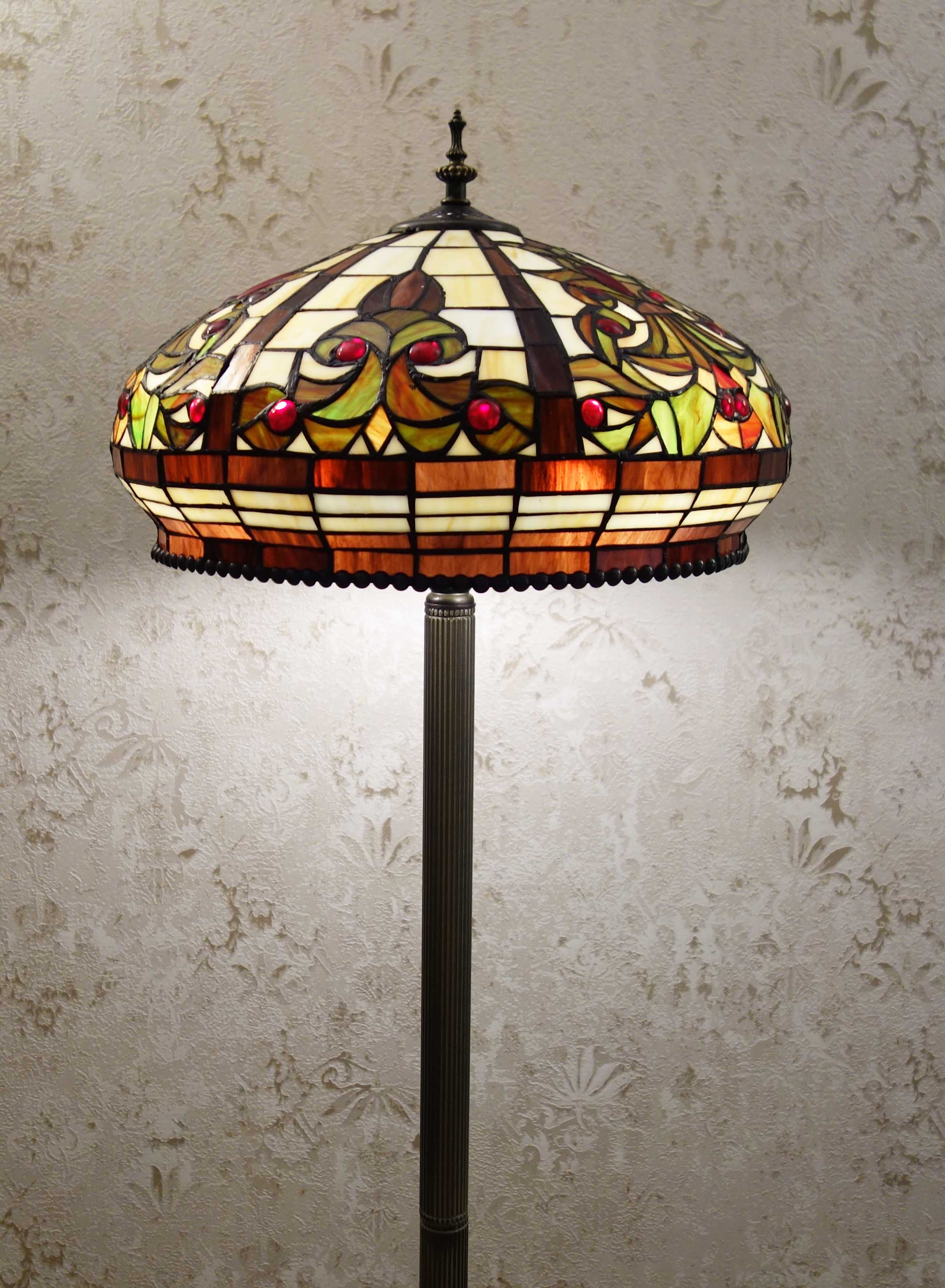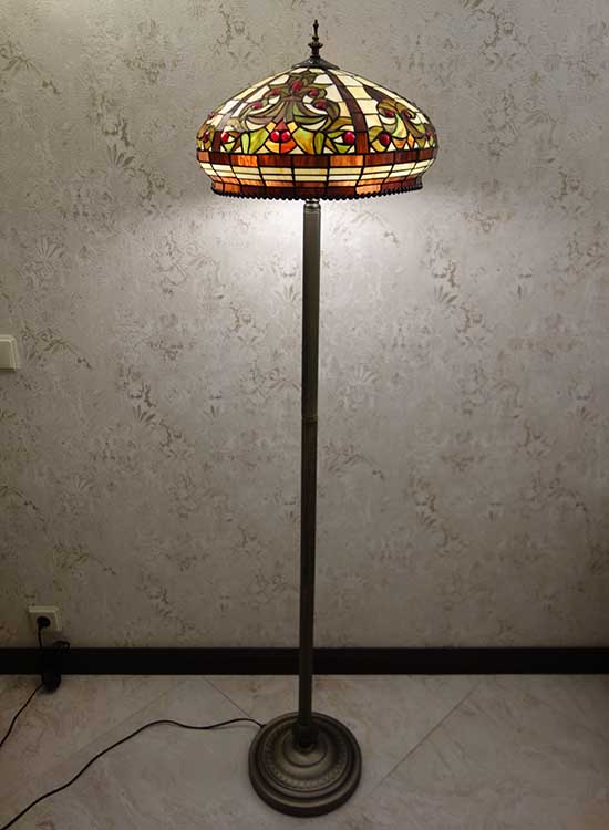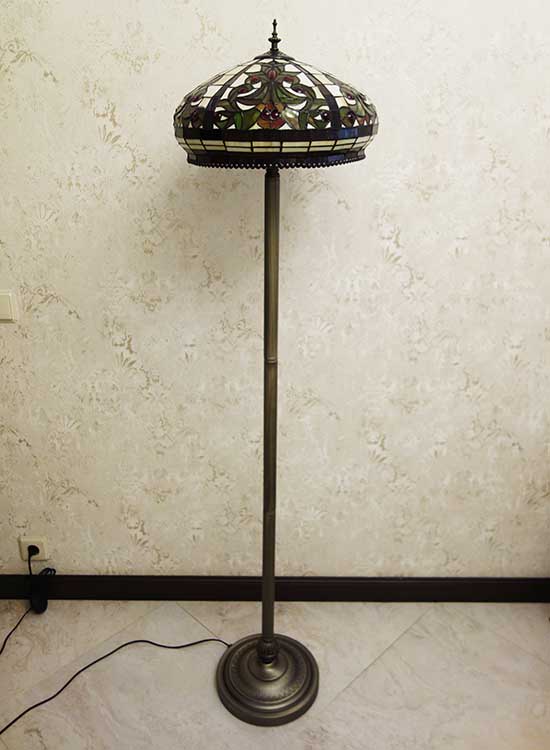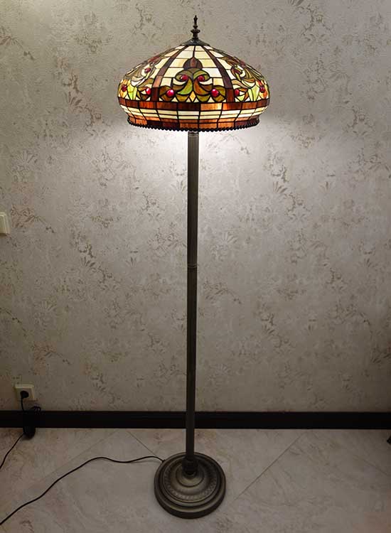 Напольный светильник Tiffany выполнен из витражного стекла. Ручная работа. Геометрический рисунок в сочетании с изящными повторяющимися узорами. Ножка торшера из металла бронзового цвета с переключателем на шнуре.