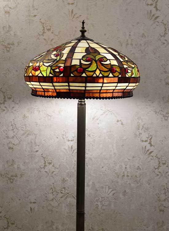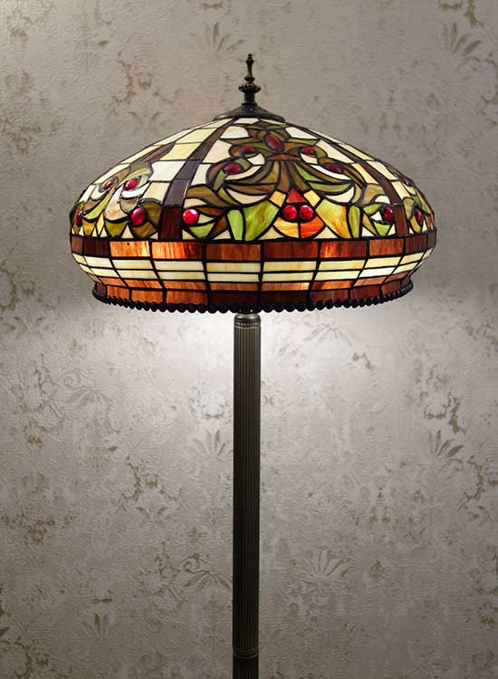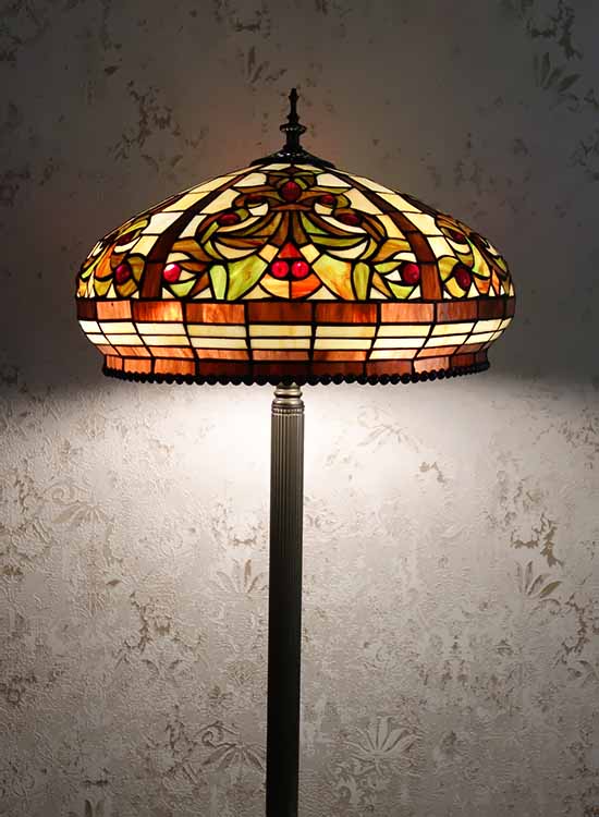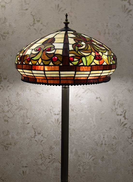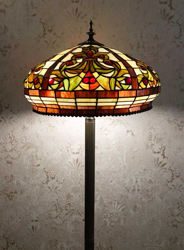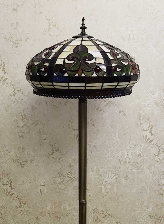Напольный светильник Tiffany выполнен из витражного стекла. Ручная работа. Геометрический рисунок в сочетании с изящными повторяющимися узорами. Ножка торшера из металла бронзового цвета с переключателем на шнуре.