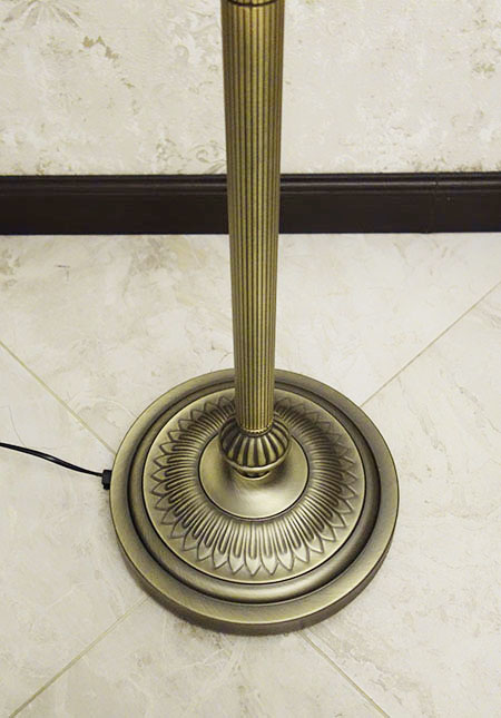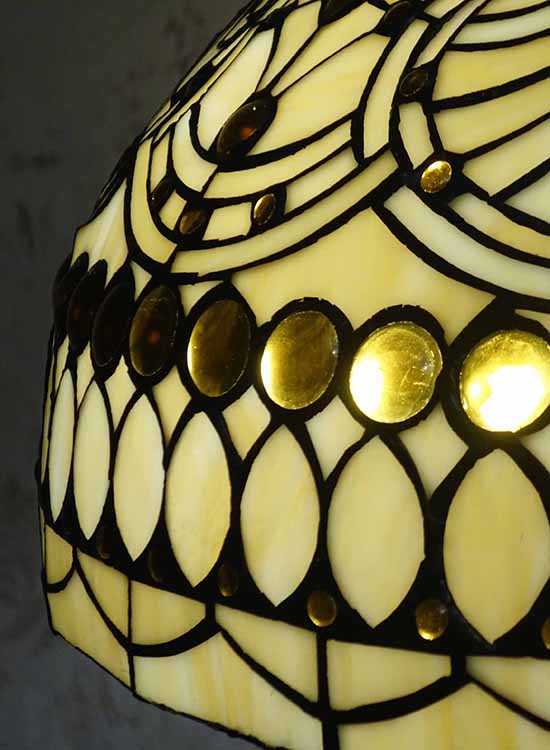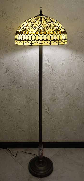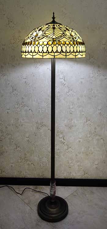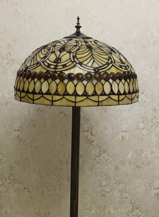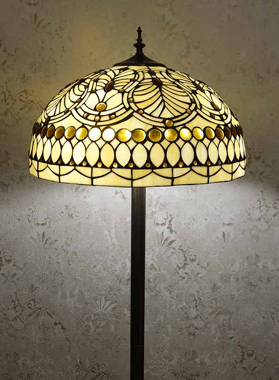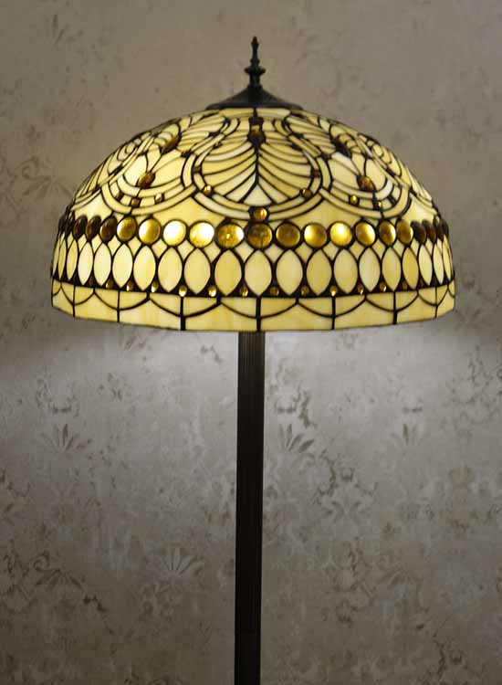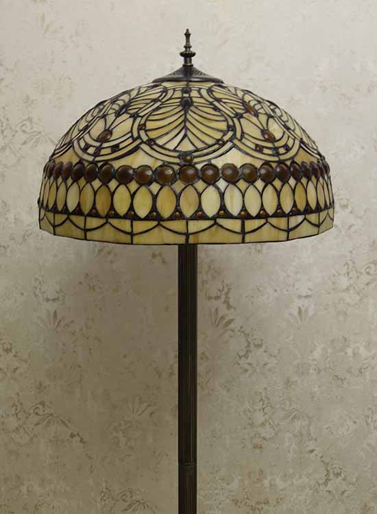 Торшер Тиффани с повторяющимся симметричным узором выполнен из мелких кусочков стекла. Чистые цвета стекол в сочетании с приятным ненавязчивым рисунком делают светильник оригинальным произведением искусства.